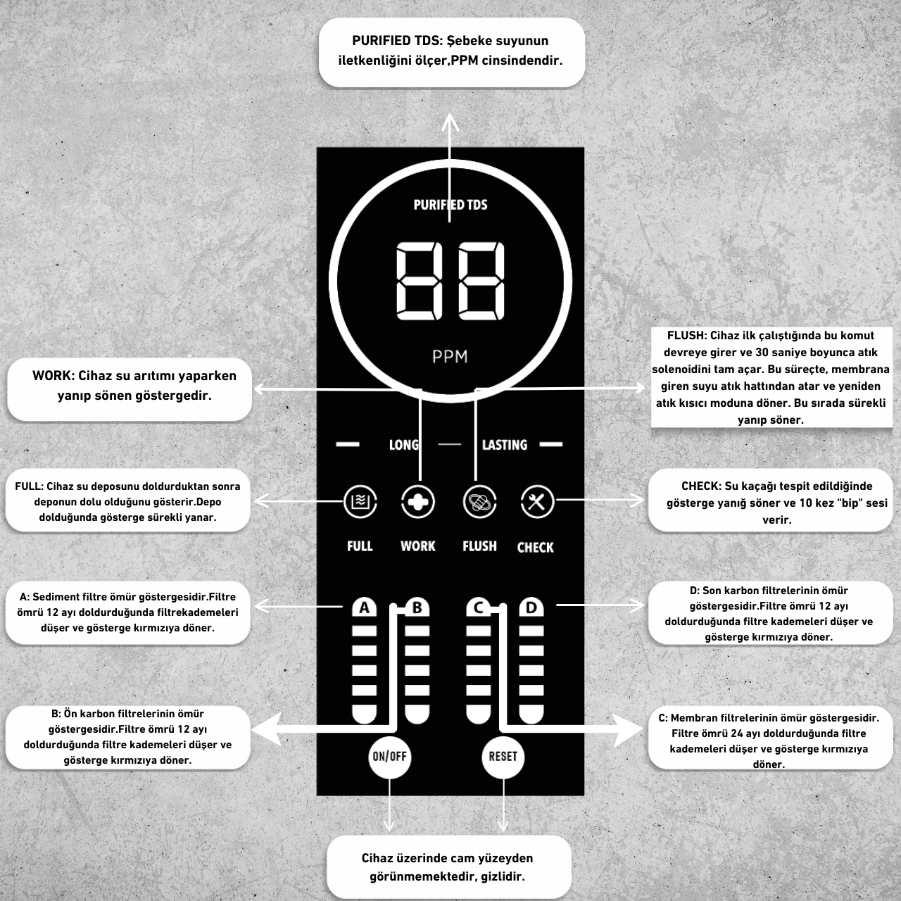 Kullanıcı dostu arayüzü ile TDS değerini göstererek suyun kalitesini anlık olarak izlemenizi, su arıtma işleminin aktif olup olmadığını kontrol etmenizi ve su deposunun dolu ya da boş olduğunu öğrenmenizi sağlar.