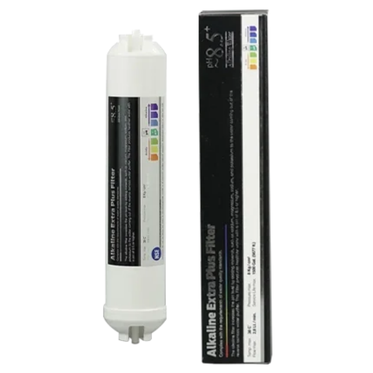Alkali extra plus filtre, reverse osmosis su arıtma cihazından çıkan suya kalsiyum, magnezyum, sodyum, potasyum gibi mineraller ekleyerek pH seviyesini yükseltir. Bu filtre pH 8,5 ve üzeri değer ile daha sağlıklı su üretir.